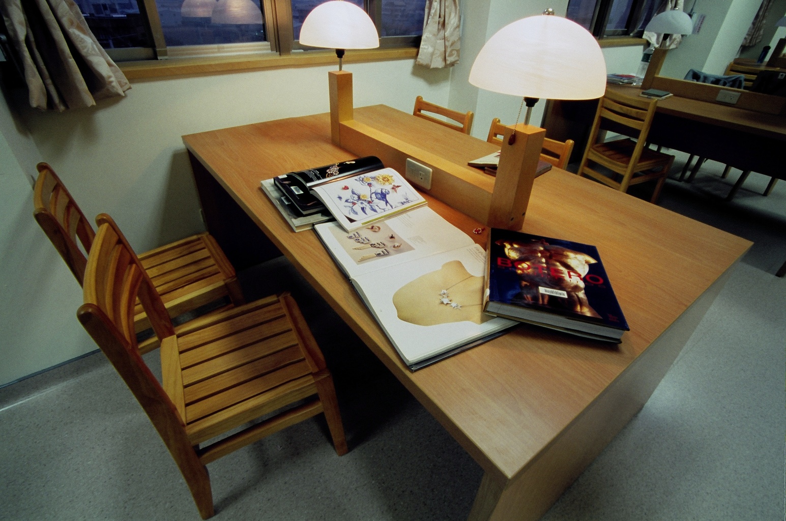 圖書館窗邊的閱覽座位,木頭桌面上擺著圓形罩燈,營造出一種靜謐的閱讀氛圍,大家猜猜看這是哪裡?